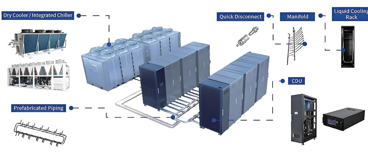 Coolnet focuses on the research and development of data center cooling products, offering a full serial of products from liquid-cooling Rack, CDU, manifold, immersion tanks, prefabricated piping, and primary side cooling sources to meet the cooling needs of various data centers. The integrated design of dry coolers and supplementary cooling units, with air-cooled modules and liquid-cooled modules sharing a set of cold water trays, which could reduces costs, saves space, and facilitates on-site installation.